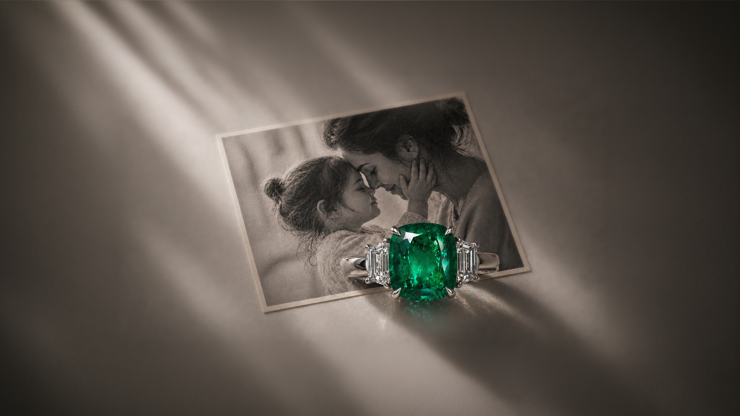 Centered around a vivid Colombian emerald, Evara is framed by a delicate halo of round diamonds that amplify its depth and brilliance. The refined silhouette and balanced proportions create a timeless elegance—subtle, luminous, and effortlessly sophisticated.